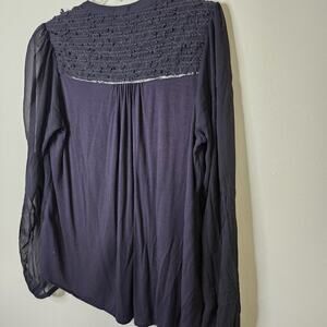 The TINY Anthropologie Embroidered Keyhole Neck Blouse Top in Women's Size L is a stylish and versatile piece perfect for various occasions. Made of polyester fabric with a rayon feel, this long-sleeve blouse features a round neck with a keyhole detail and metallic accents. The puff sleeves add a touch of bohemian flair, while the black color and sheer sleeves make it suitable for parties, casual outings, or even travel. Easy to care for with a hand wash only requirement, this lightweight and breathable blouse is a must-have for any woman's wardrobe. Excellent Condition