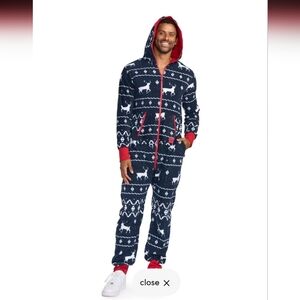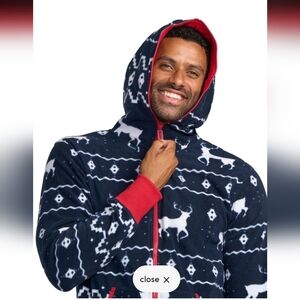 Tired of regular old pajamas? This Christmas themed jumpsuit is perfect for lazing around in during the holidays! The dark blue backaround is accented with a white Fair Isle pattern scattered with wandering reindeer. The front pockets and zipper closure are trimmed with red piping that is echoed in the lining of the hood.