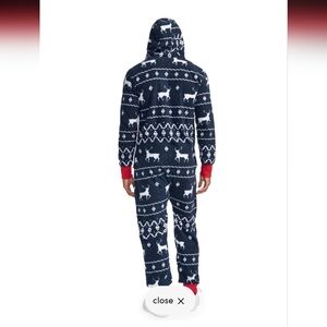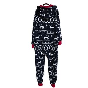 Tired of regular old pajamas? This Christmas themed jumpsuit is perfect for lazing around in during the holidays! The dark blue backaround is accented with a white Fair Isle pattern scattered with wandering reindeer. The front pockets and zipper closure are trimmed with red piping that is echoed in the lining of the hood.