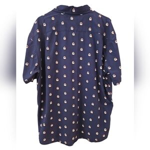 Pre-owned. Very good condition. Dark blue short sleeve button up shirt with patriotic eagles printed on the shirt.. Chest pocket on the left with TE embroidered on it. 7 button closure.