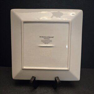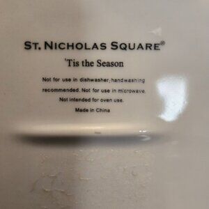 TIS THE SEASON BY ST NICHOLAS. SET OF 2 PLATES. VERY HEAVY. DESSERT PLATES. NO CHIPS OR CRACKS. DISSCONTINUED DESIGN. 8 1/2 INCHES IN WIDTH AND LENGTH.