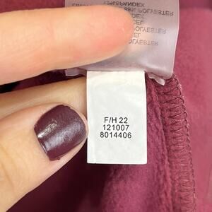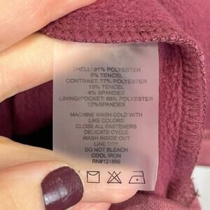 1/2 zip, funnel mock neck, long sleeves, pullover style, pockets, finishes well above the knee. Cozy polyester / Tencel knit with a fleece-y interior in dusty rose pink.