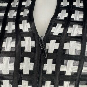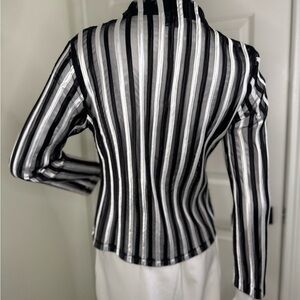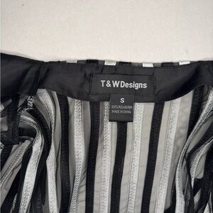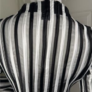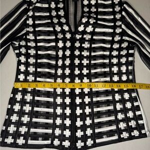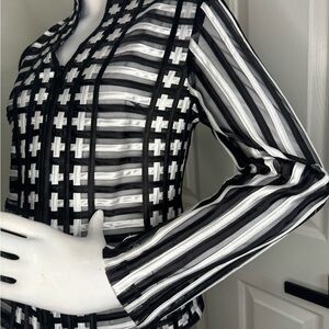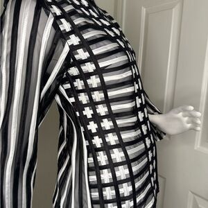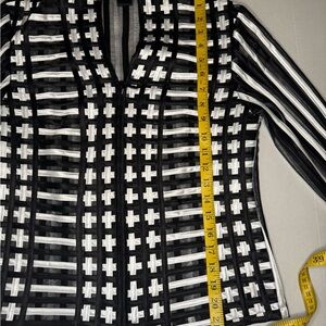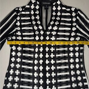 This elegant tunic from T&J Designs showcases a striking black and white graphic pattern, perfect for making a bold statement. The fitted design features a mandarin collar and long sleeves, offering a modern and sophisticated look. Crafted with attention to detail, this top is ideal for those who appreciate a blend of style and comfort in good condition.