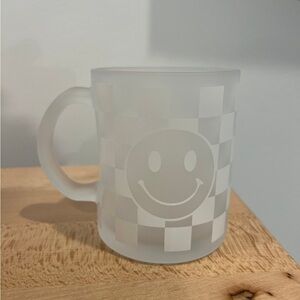 Clear and frosted checkered smiley face glass mug. Hand wash only