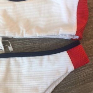 Ribbed two-piece set from TJ Swim new with tags. Embrace your inner sports chic with this set! I bought at the end of last season and I now realize that the bottoms are a little too small on me. This Australian brand runs small (for reference I'm 5"4 120 lbs 34B). Bottoms are a S and Top a M.