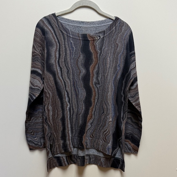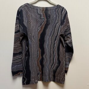 Stylish top with swirl pattern. Features a mix of dark and light tones. Perfect for casual wear. No brand listed or size. Looks like a medium-large sweater.