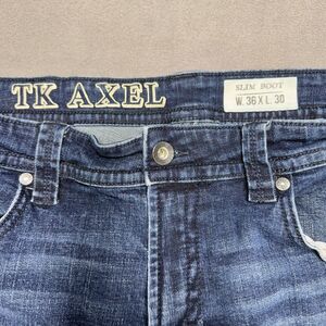 TK Axel Jeans Mens 36x28 Low Slim Boot Stretch Dark Wash Loose American Denim. Materials can shrink or stretch over time. Measurements in pictures. Good looking condition, may show some signs of wear/use. Please see the pictures for additional description and the actual condition. Comes with what's pictured and nothing more. Colors may differ slightly depending on your monitor.