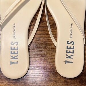Stylish TKEES sandals with a snakeskin pattern. Thong style tan straps. Perfect for casual outings.