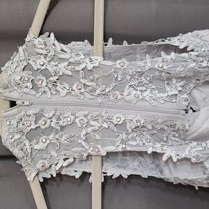 TLC Say Yes To The Prom Dress Juniors Gray Iridescent Stones 3 Ruffly Layers 7. Keyhole neck and back. 3 sheer meshy ruffly layers. High-low hem. Lined. Floral appliqued. Pissibly make-up on neck, see pic. Barely noticeable and it could just be my eyes. Dry Clean Only. Pre-owned, overall beautiful condition.