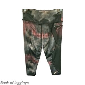 Abstract workout cropped leggings are are a Size Small Waist: 24-26" Inseam: 19" & Cropped length: 26" Pants feature a stretchy waist & Side phone pocket ,on right leg there is black power mesh overlay as well with a cropped length. Breathable Stretchy & easy to move in. Both garmets are made of a Polyester/ Spandex blend material .