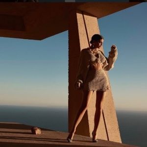 Contemporary knitted skirt set made popular by Kylie Jenner will surely turn heads! The fully knitted V neck backless crop top has unfinished edges and extravagant sleeves. Fray is around the neckline and wrist. The fully knitted distressed skirt has an elastic waistband and frayed distressed look on the bottom edge of skirt. In great condition. Worn only once.