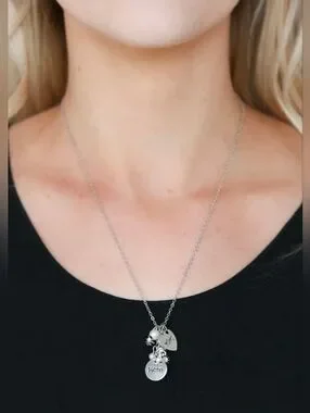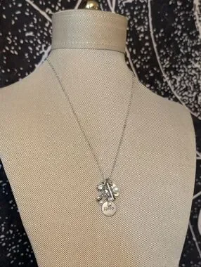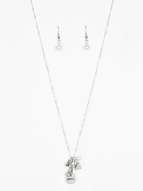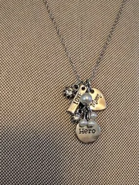 A collection of dainty white pearls, glittery white rhinestones, and charms stamped in the inspirational words "Mom" and "Hero", create a clustered pendant below the collar. Features an adjustable clasp closure.