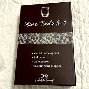 Wine tools set made of metal and plastic comes with wine opener, vacuum wine stopper, wine pourer and foil cutter. Great for party, wedding, holiday and house warming gifts. This is an essential tool! Wine opener is white with flowers.