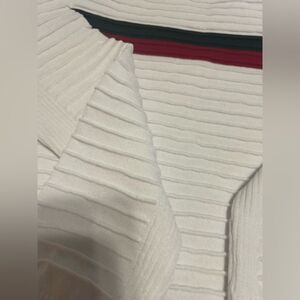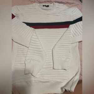 This sweater showcases a timeless crew neck style with a harmonious blend of white and red stripes. Made from a medium-weight knit, it ensures comfort and style for any casual occasion. The ribbed texture adds a refined touch to this versatile piece.