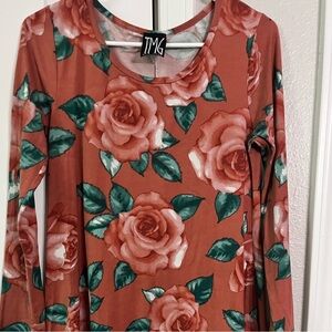 Embrace elegance with the TMG Rose Print Long Sleeve Dress. This stunning piece features a beautiful floral design in warm tones, perfect for any occasion.