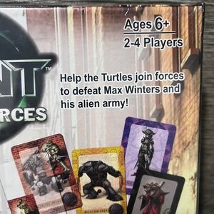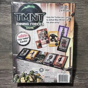 Unleash your inner hero with this brand new, sealed Teenage Mutant Ninja Turtles Joining Forces game! This captivating game, designed for ages 6 and up, invites 2-4 players to join Leonardo, Raphael, Donatello, and Michelangelo in their quest to defeat Max Winters and his alien army. Featuring "See Thru" cards and a capture board, this game promises hours of strategic fun and cooperative gameplay. The box includes 40 TMNT cards, 9 Alien cards, and 1 Splinter card, ensuring a complete and engaging experience. Perfect for family game nights, birthday parties, or a fun afternoon with friends, this TMNT game will bring the excitement of the sewers to your living room.
