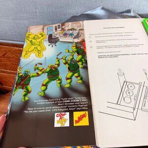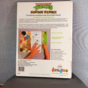 Up for sale is a collectible Vintage 1990 Sight 'n Sound book, the Teenage Mutant Ninja Turtles Sound Story Invasion of the Robobugs. This electronic storybook from the height of the TMNT craze is a perfect piece of nostalgia for any fan or collector. The book contains the full 24-page illustrated adventure featuring Leonardo, Donatello, Michelangelo, and Raphael battling the Robobugs. Please note: This no longer works/produces sound effects. The book is not in great shape. The spine and binding are loose, there is tape on some of the spine, the corners have wear, and it was once inscribed but has been blacked out with marker. I'm basically selling this as is for someone to enjoy the story or to put on display because they had one as a kid and might like to have it again. Thanks for looking!