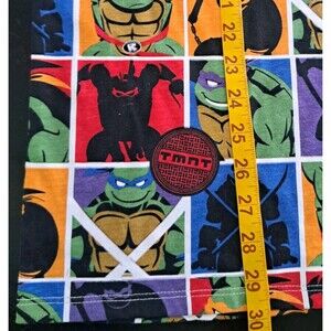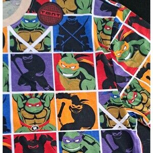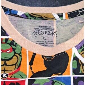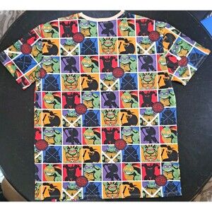 TMNT Teenage Mutant Ninja Turtles mens t-shirt, size XL. Features a vibrant all-over graphic design with the classic turtles, making it a bold retro-style statement piece.