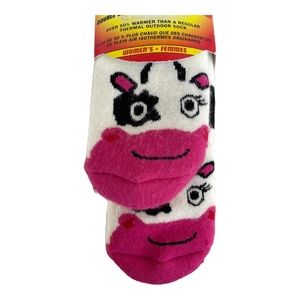 Adorable pair of dual layer thermal socks featuring a smiling cow