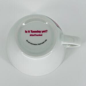 "Is it Tuesday yet? and #GetThanked" in hot pink on the bottom of the cup