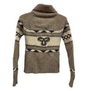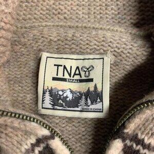 Stay cozy this season with the TNA Aritzia Brown 100% Lambswool Zip Up Long Sleeves Sweater Cardigan. This pre-owned sweater has a tight-knit pattern, featuring a collared neckline and a slim fit for a stylish look. The Aztec themed graphic print on the front adds a unique touch, while the full zip closure in the front provides versatility in layering.