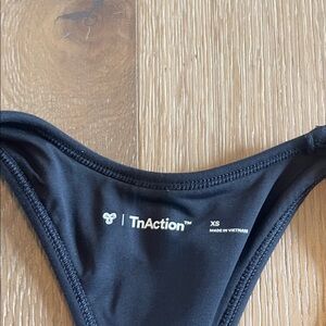 Stylish black sports bra with TnAction branding. Ideal for active wear.