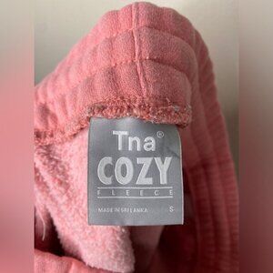 Super cozy TNA shorts, in a pretty heathered pink colour. They sit around mid thigh. 78% Cotton 22% Polyester