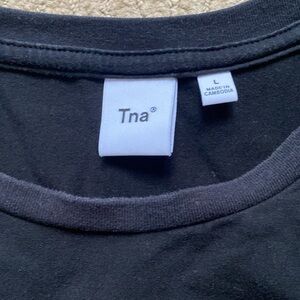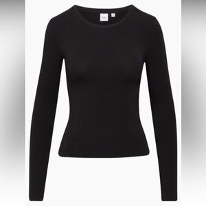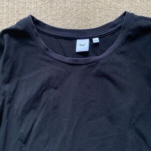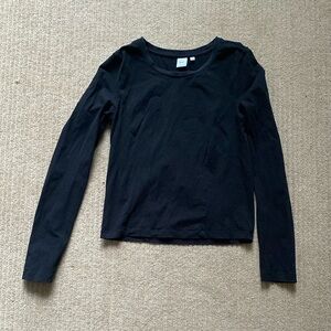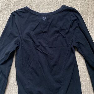 Long-sleeve fitted shirt, stretchy and soft material, Black, size L, true to size. In good condition but there is some wear and tear in a form of some colour fading on the collar and seams.