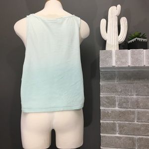 TNA light blue to dark blue ombre tank. Pictured with and without flash for color clarity. Its cropped in the front and will show some tummy, but comes down farther in the back. Shallow scoop neck and large arm holes, muscle shirt type look. Its in great condition except for small mark on left chest ***please note this if you're interested in buying*** . I have washed it but it didn't come out. Luckily its not too noticeable in my opinion.