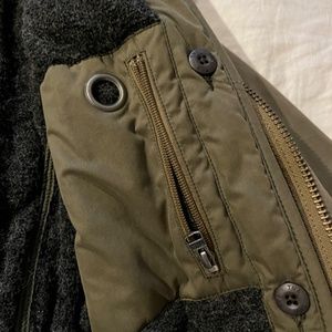 TNA winter coat. Fully unzip lining, remove hood, change w fur or without. Wear as a parka or winter coat with lining. Water resilient.