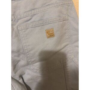 The TNA Greenwich High Waisted Relaxed Twill Carpenter Pants are a pair of pants for women. They are light blue in color and made of cotton. The pants have a flat front and a high rise. They also have pockets and are machine washable. The pants are a size 10 and have a straight leg style.