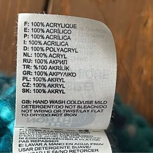 The North Face winter hat, with a distinctive pom-pom on top. The hat is crafted with a thick, chunky knit in shades of blue, white, and purple. The brand logo is visible on the lower edge of the hat.