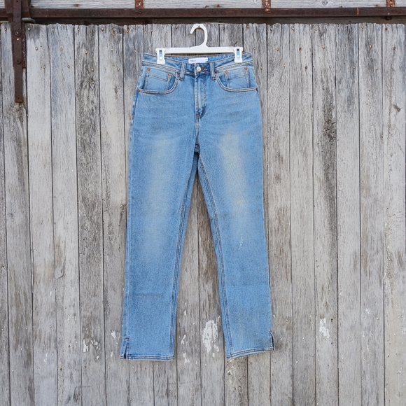 They are a lightwash color of straight leg, high rise style of jeans. They have a split hem detail. There are light signs of wear on the knees. It's in good pre-owned condition, Size 28