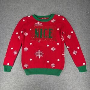 To Be Jolly women’s holiday sweater in size Medium, featuring reversible sequins that flip between “NAUGHTY” and “NICE.” Festive red base with white snowflake graphics and green ribbed trim at the collar, cuffs, and hem. Made from a soft, midweight knit blend of cotton and acrylic for cozy comfort & warmth. Great for Ugly XMas Sweater Gatherings of the holidays.