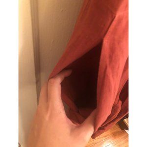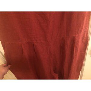This is a sold-out, 100% linen, garment-dyed drop-crotch jumpsuit by the UK brand TOAST. Hard-to-find in US stores. Color is a reddish-orange clay.