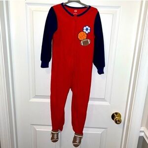Sport theme footed PJs in good, pre-owned condition red ones have a bit more wear on the bottom of the foot (tread) no holes