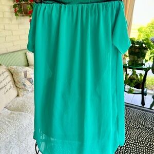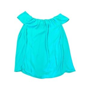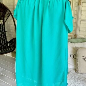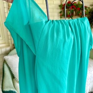 TOBI, NWOT, WOMENS TUNIC. SHEER, OFF-SHOULDER SLEEVES, GATHERED, SHIRRED FRONT & BACK NECKLINE, LINED. TURQUOISE COLOR. 100% POLYESTER. SIZE XS