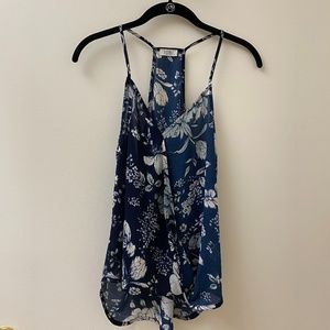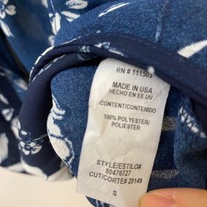 Sheer chiffon-like navy and white floral top. Goes with anything. True to size. Size small.