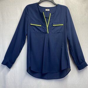 TOBI Semi Sheer Slit Crew Neck Long Sleeve Blouse Women Small Navy Hi-Lo Hem