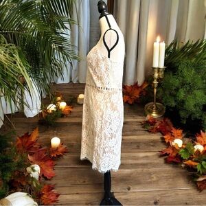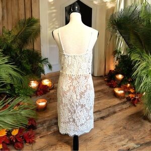 Gorgeous white floral lace overlay dress from Tobi, size XL. Features adjustable spaghetti straps, nude lining for contrast, and a sheer lace waistband accent. The back has a zip closure, and the hemline is delicately scalloped.