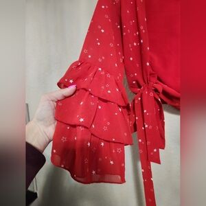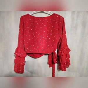 Embrace your love for the stars with this chic Tobi wrap crop top, size XS, boasting a vibrant red hue that's sure to stand out. The ruffle sleeves add a playful, yet sophisticated touch, making it an ideal choice for casual outings or weekend get-togethers. The blouse is designed with a flattering V-neck and a comfortable pullover closure, ensuring an easy fit for your everyday style.
