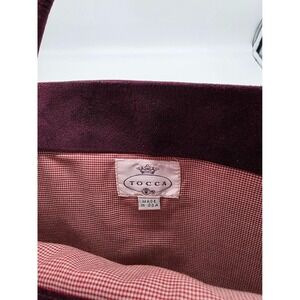 Elevate your collection with this authentic TOCCA tote—a stunning blend of vintage elegance and everyday functionality. Crafted in the USA from rich burgundy suede, this rare find features an eye-catching gold clasp and classic tote silhouette.