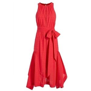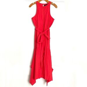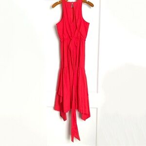 // designer red coral beach vacation everyday casual wedding guest orange bright spring summer resort lace high neck midi asymmetrical sophisticated orange reunion asymmetrical keyhole waist tie midi maxi calf length //