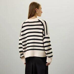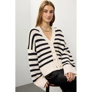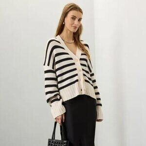 Black stripe. Knit. V-neck. Long sleeves. Front button closure.