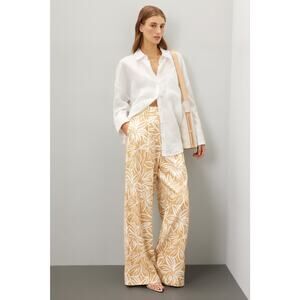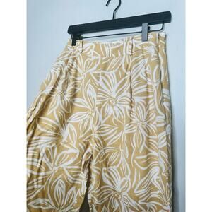 TOCCIN X RTR Brown Tan Floral Printed Wide-Leg Linen Blend Classic Trousers 6 Features: Brand: TOCCIN X RTR Type: Pants Size: 6 Color: Brown Tan Material: 55%Linen,45%Rayon Lining: 100% Polyester Floral Printed Linen Blend Wide-Leg Classic Trousers The TOCCIN x RTR Printed Linen Classic Trousers in size 6 offer a harmonious blend of tailored sophistication and relaxed summer style. Crafted from a breathable linen-rayon blend (55% linen, 45% rayon), these trousers feature a rich brown base adorned with a bold tan floral print, adding a touch of vintage-inspired elegance. The high-rise waist (11.5") and wide-leg silhouette, complemented by a 32" inseam and 26" leg opening, create a flattering and elongating effect. A side zipper with a hook-and-eye closure ensures a seamless fit, while functional side pockets add practicality. Pre-owned, in good condition See pictures for all details Thank you for shopping with sipsipseller