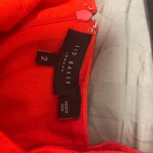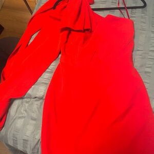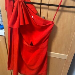 Red crepe. 92% Polyester & 8% Spandex. One shoulder. Cap sleeve. Side zipper closure. Size 2