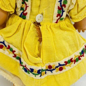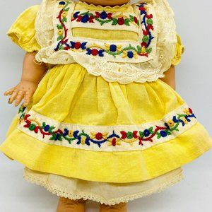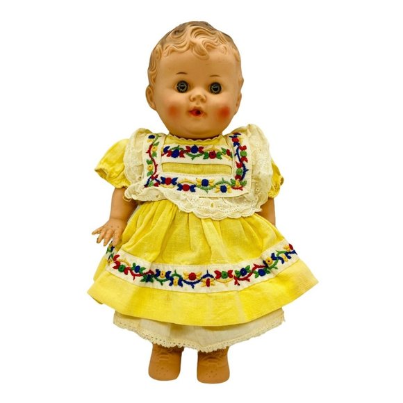 Beautiful 10" Squeeze Toy doll wearing a beautiful yellow dress, there is a rip on the back of her dress (below the lower button) as shown in photos. From Sun Rubber Company TOD-L-TOTS line. From a smoke free and pet free home. Squeek inside doll is working. 10" Tall.