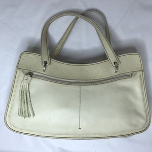 TOD'S cream / off white pebbled leather shoulder bag / handbag. Magnetic snap closure. Silver tonal hardware. Double outside pockets on front. Single large main compartment. Zip pocket on back with tassel zipper. Full leather body. Fabric lined inside. TOD'S logo stamp on front and authenticity patch inside. Made in Italy.