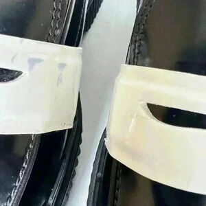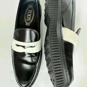 TODS Spazzolato Leather Black Platform White Penny Strap Loafer in a size 40/10. In great condition. Has a flaw where the dye has bleed out a bit on white part of the leather (see photos). With a casual chic look and the sleek style of a Tod’s shoe, these platform Penny loafers will transform your everyday collection. Constructed in black leather, these shoes feature white leather accent strap at the front along with a ribbed chunky platform sole and heel that will give you a distinct look.