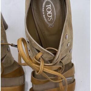 TOD'S Tan Cutout Leather Paneled Two Toned Suede Cone Heeled Sandals Sz 39/US 8.